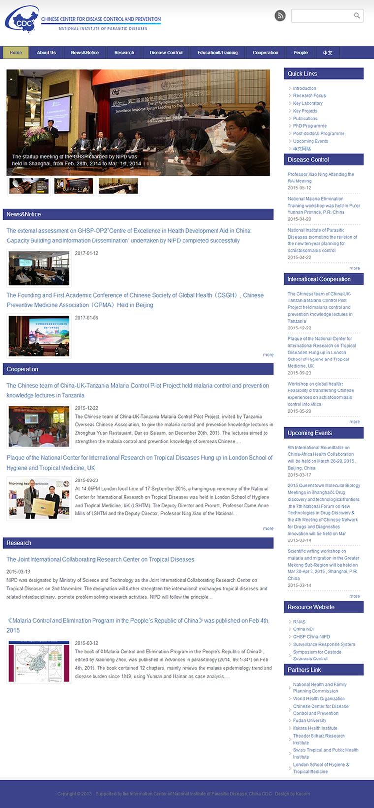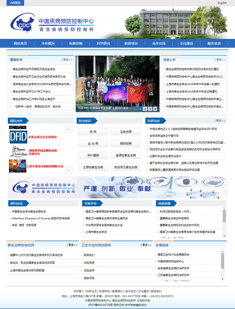 中國(guó)疾病預(yù)防控制中心寄生蟲病預(yù)防控制所,前身為中央衛(wèi)生研究院華東分院,1950年建于南京,1956年定名為中國(guó)醫(yī)學(xué)科學(xué)院寄生蟲病研究所,1957年與中國(guó)醫(yī)學(xué)科學(xué)院海南瘧疾研究站合并,遷址上海,1983年劃歸中國(guó)預(yù)防醫(yī)學(xué)科學(xué)院領(lǐng)導(dǎo)。2002年1月23日更名組建為中國(guó)疾病預(yù)防控制中心寄生蟲病預(yù)防控制所。
